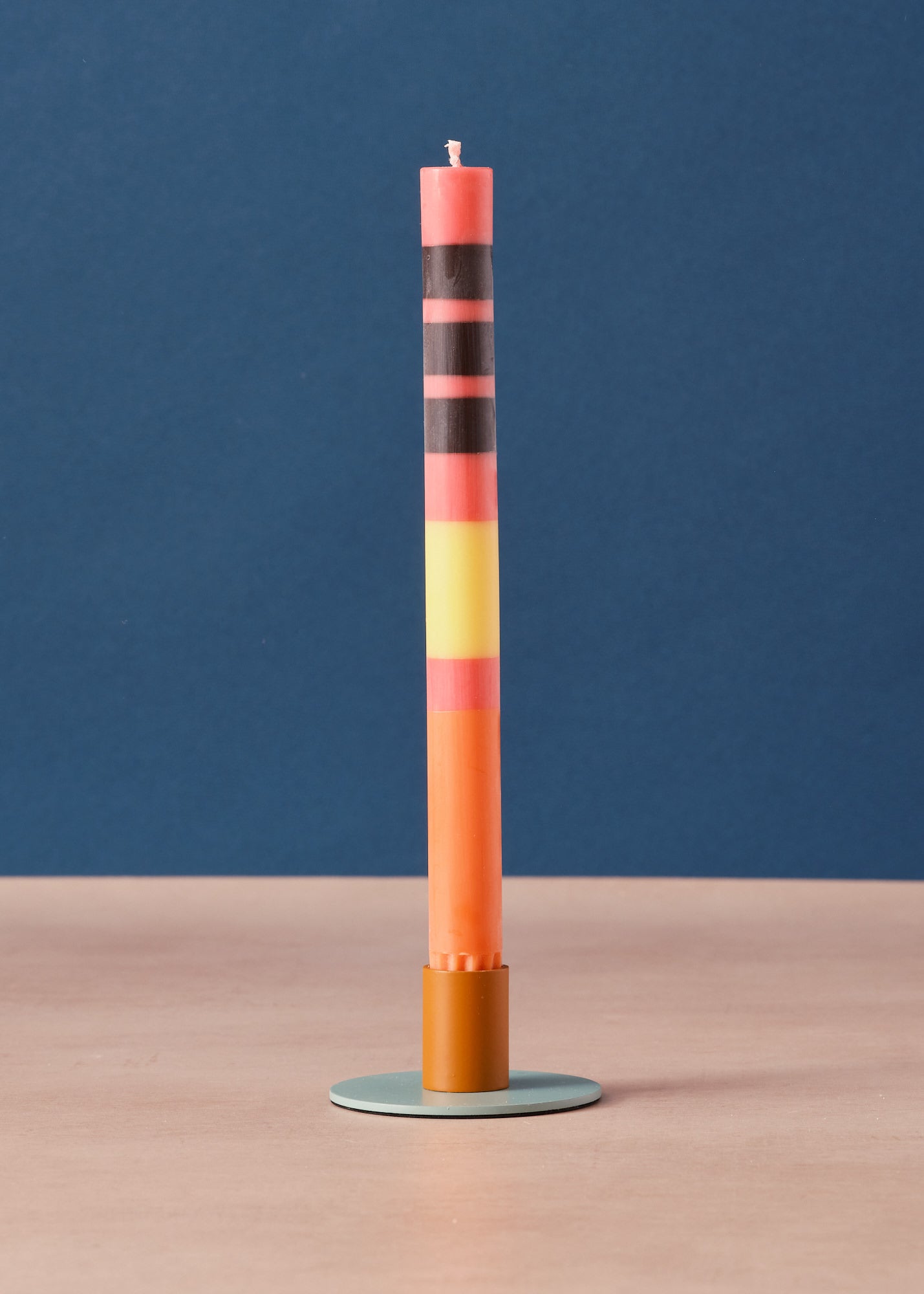 A simple, two-tone candleholder suitable for standard sized dinner candles.
