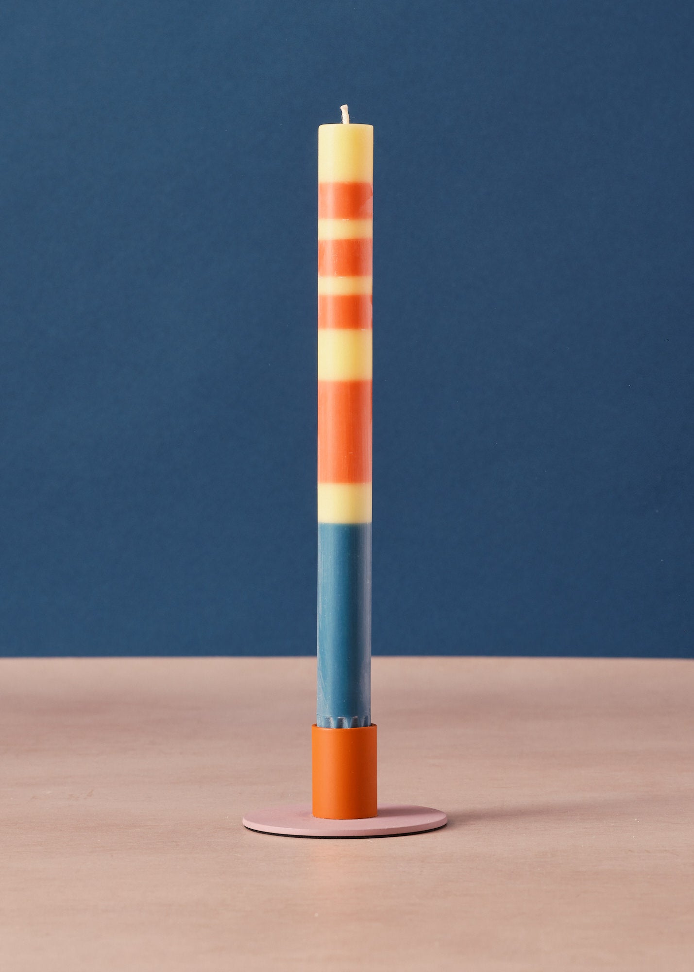 A simple, two-tone candleholder suitable for standard sized dinner candles.