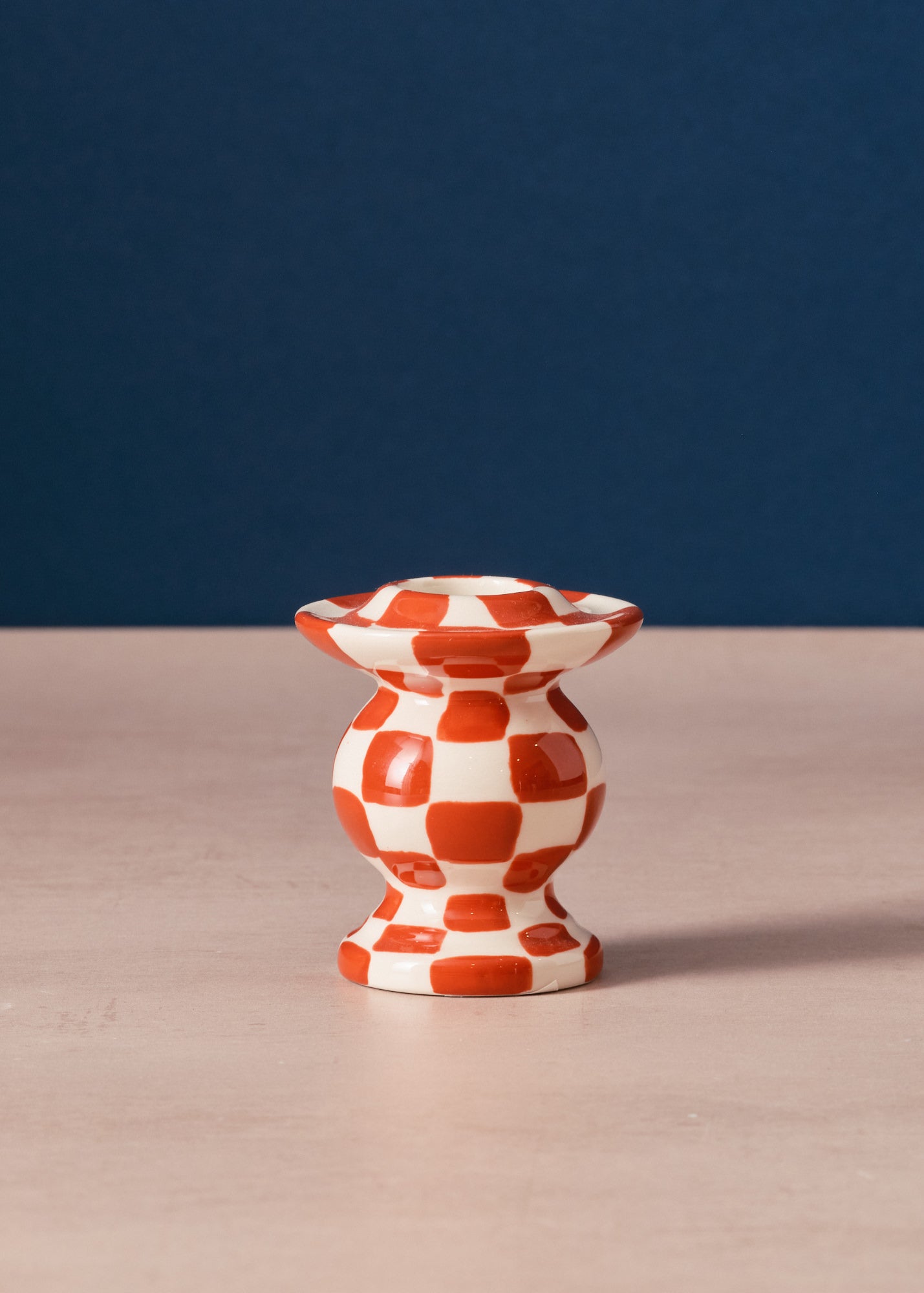 Hand painted ceramic candle holder in a checkerboard pattern.