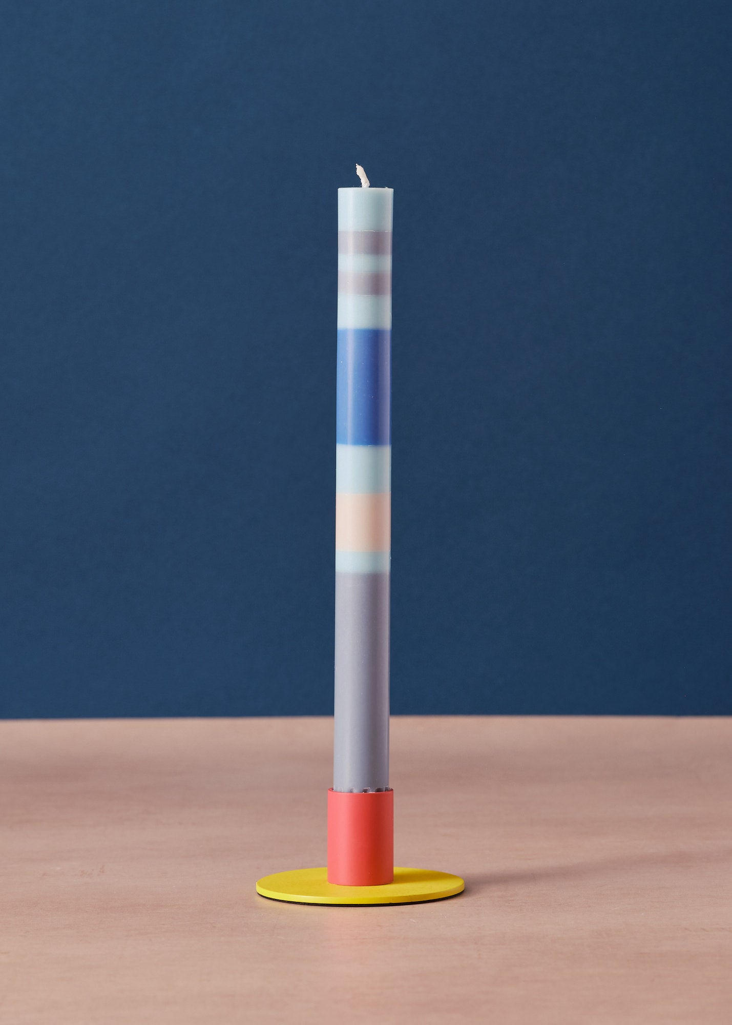 A simple, two-tone candleholder suitable for standard sized dinner candles.