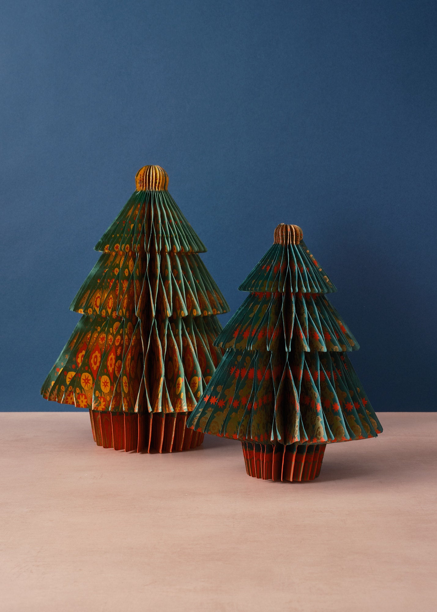 Composed of intricate layers of recycled cotton paper, each decoration unfolds to reveal a three-dimensional tree honeycomb.