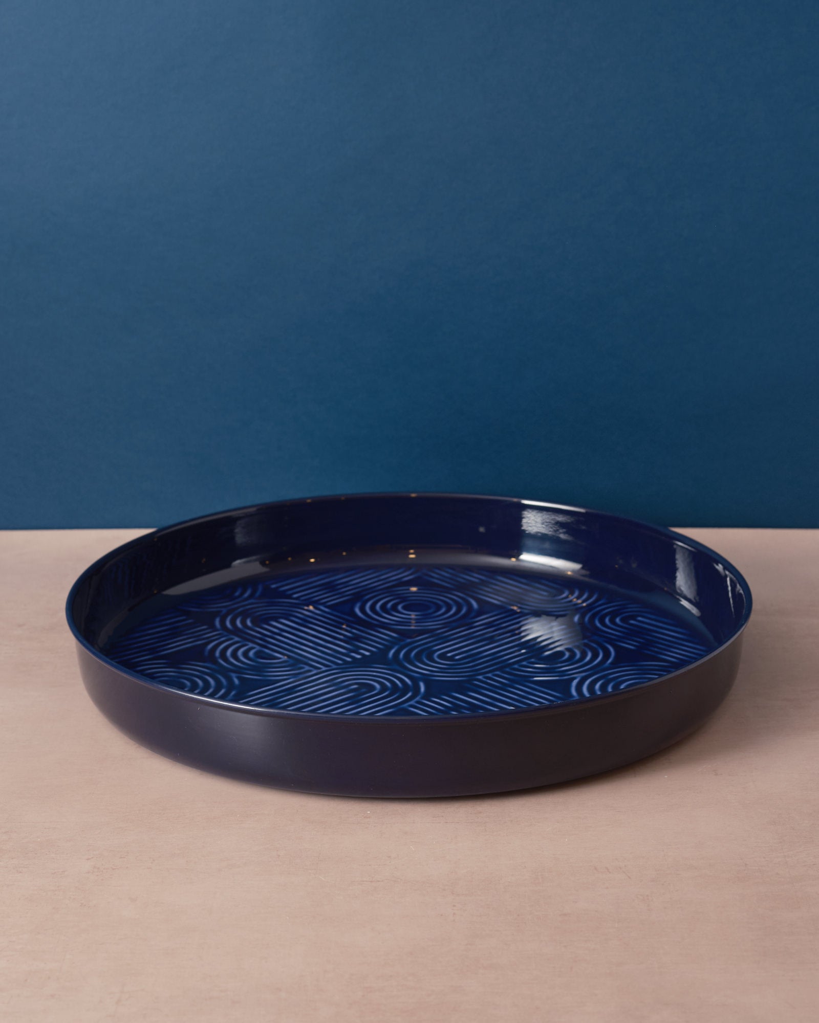 This handcrafted tray is made from enamelled steel and finished with an embossed pattern. Perfect for serving drinks, foods or even as storage on the coffee or kitchen table.